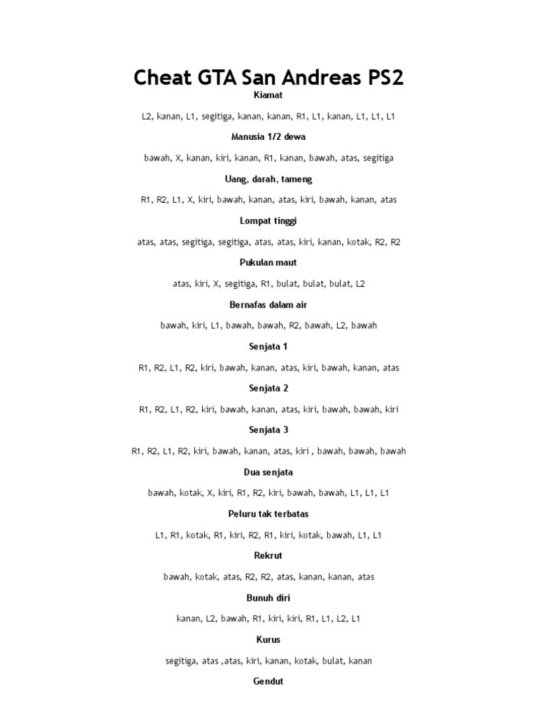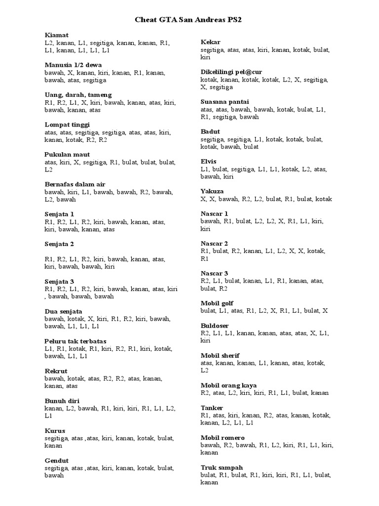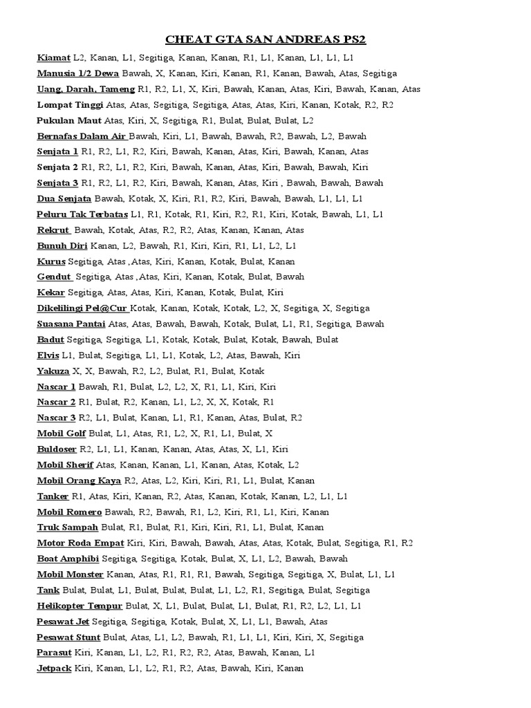 Cheat Gta Docx 100 Pasword Gta San Andreas Ps2 0 Tsunami Atas Bawah Segitiga Kotak Bawah Kiri Lingkaran U2026 R1 R2 L1 L2 1 Badai Pasir Pada Saat Bermain Course Hero from www.coursehero.com 11 cheat mobile legends (ml) terbaru di 2020, script hack gg. Kode cheat gta 3 pc, lengkap dan bisa langsung dicoba 11 cheat free fire terbaru di 2020, script. 56 kode cheat gta vice city pc, bisa langsung cobain! Tips cara menang mudah higgs domino dengan cheat x8 speeder mod apk terbaru 2021; Cheat mortal kombat shaolin monks ps2 lengkap, cheat untuk membuka karakter dan mode permainan yang terkunci Jun 30, 2021 · kode cheat the sims 2 ps2, terlengkap juni 2021; Jalantikus adalah website teknologi berbahasa indonesia yang menyajikan informasi gadget, game android, ios, film, anime dan informasi teknologi lainnya.
