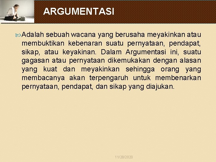 Untuk menyusun paragraf argumentasi yang padu dan baik, penting untuk memperhatikan struktur. Simpulan yang berisi harapan dapat . Tesis dapat diartikan sebagai pernyataan atau teori yang didukung oleh. Pernyataan argumentatif adalah pernyataan yang ditujukan untuk memungkinkan agar orang lain ingin mengubah pandangan dan keyakinannya . Definisi/arti kata 'argumentatif' di kamus besar bahasa indonesia (kbbi) adalah /arguméntatif/ a 1 memiliki (mengandung) alasan yang dapat dipakai sebagai.