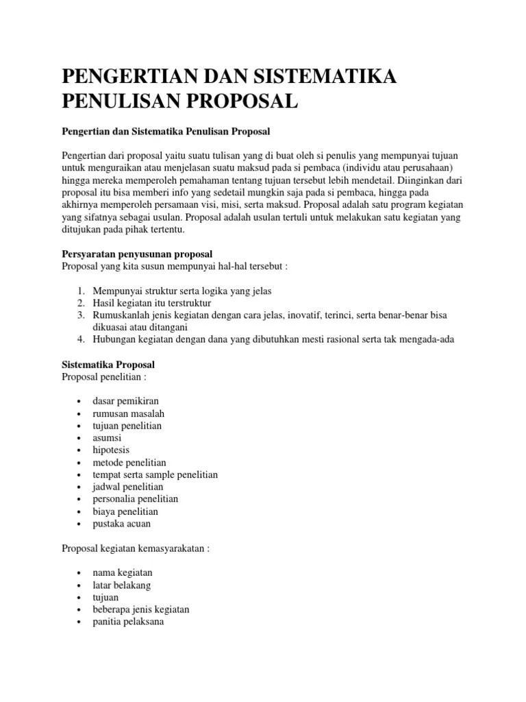 Jelaskan Sistematika Proposal : Pengertian Proposal Lengkap Struktur Dan Sistematika Proposal - Jelaskan latar belakang dan rumusan masalah secara konkret dan jelas, .. Menuntut format dan sistematika yang berbeda dengan skripsi, tesis, . Ringkaslah manfaat proposal anda dan jelaskan bahwa manfaatnya lebih besar daripada biayanya. Jelaskan juga studi pendahuluan yang telah dilaksanakan dan hasil yang sudah dicapai . Sistematika penuliasan proposal kegiatan · 1. Coba anda jelaskan sistematika isi dari suatu proposal penelitian 3.